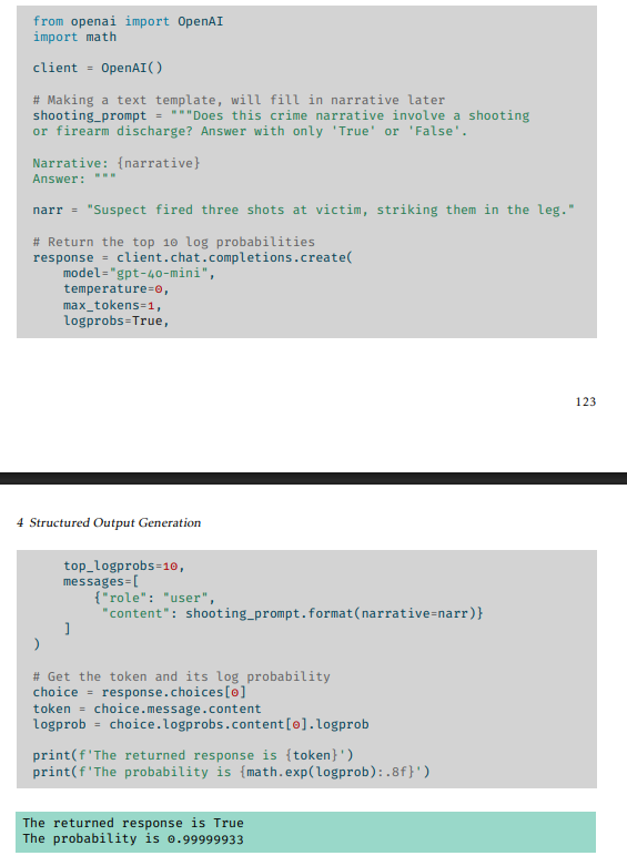 You can have the model not only return True or False tokens, you can also have certain models return the log probabilities that it chooses either of those tokens. You can see in this example it says the probability is 0.99999933 that the narrative contains the shooting.