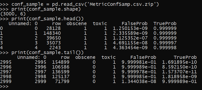 I then batch process a conformal sample of 3000 cases, and a total out of sample test sample of 50,000 records. The conformal sample I intentionally sample 1000 cases of obscene comments, 1000 cases of comments with no toxicity, and 1000 cases of comments with other toxic text (but are not classified as obscene). You can find code to replicate here on github. This just shows the end result analysis, which I saved the resulting classifications and log probabilities into 'MetricTestSamp.csv.zip' for the test sample of 50,000 records, and 'MetricConfSamp.csv.zip' for the conformal sample of 3000 cases.