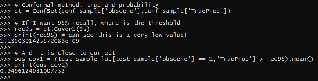 So here I use my conformal class (see the prior blog posts), passing in the predicted probabilities and the true outcomes in the conformal sample. Then I ask “what is the threshold needed to get 95% recall with this data”.